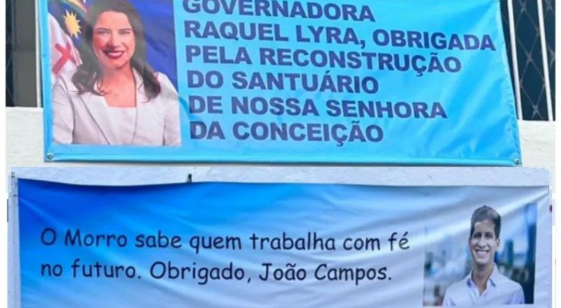 “Obrigado minha governadora. O Santuário de Nossa Senhora da Conceição ficou Novinho”, diz uma das faixas colocadas no muro de uma casa na subida do morro. “Obrigado prefeito João Campos. Com você o morro será sempre mais forte”, diz outra, colocada no outro lado da rua.