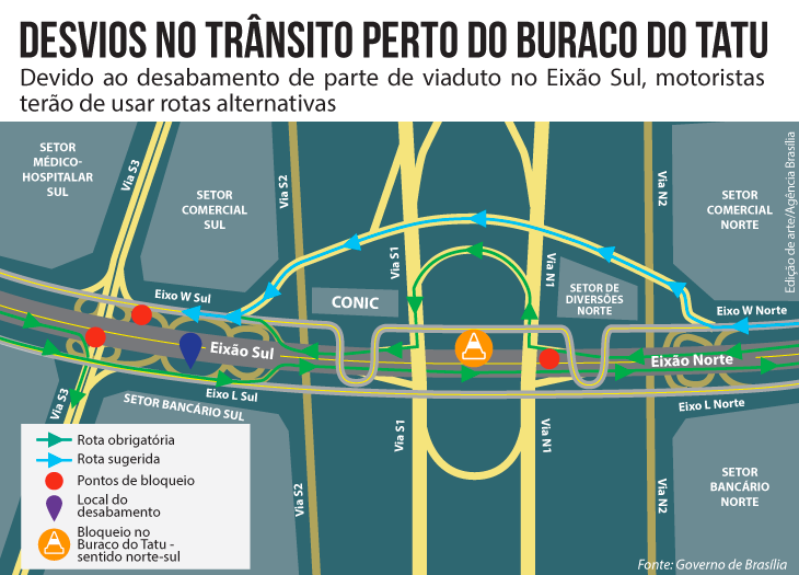 Como o Buraco do Tatu está parcialmente fechado, quem sair do Eixão Norte em direção à parte sul terá de acessar o Eixo Monumental e retornar após a Rodoviária do Plano Piloto para entrar no Eixo W Sul (veja rota verde na arte).
