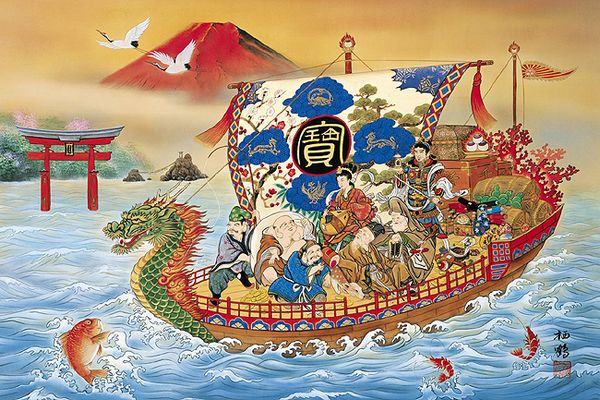 Os sete deuses em sua arca, o Takarabune, estão relacionados ao Ano Novo no Japão e são utilizados normalmente para trazer presentes, fortuna, felicidade e sorte. A superstição mais comum é colocar esta imagem debaixo do travesseiro, no dia de Ano Novo para começar o ano da melhor forma possível.