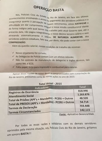 A população receberá nas delegacias que aderirem à paralisação um documento que justifica a dificuldade da unidade em dar cumprimento aos procedimentos, explica a situação passada pela categoria e presta conta dos serviços realizados em 2015.