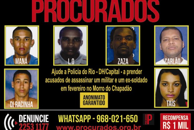 Seis suspeitos de terem assassinado o militar Jorge Fernando da Costa Souza, de 24 anos, e Cleyton Fellipe Massena de Souza, de 22, foram identificados pela Polícia Civil e o Disque-Denúncia oferece R$ 1 mil por informações sobre o paradeiro deles. Leandro Augusto Trindade de Jesus, o Maná; seu irmão Leonardo Augusto Trindade de Jesus, o L.O; Isaias Augusto da Silva, o Zaza; Carlos Alberto Souza da Silva, o Carlão; Marlon da Cruz Chagas, o Di Racinha; e Taís Rodrigues Raposo tiveram suas prisões decretadas por conta dos homicídios que aconteceram no início de fevereiro, no Complexo do Chapadão.