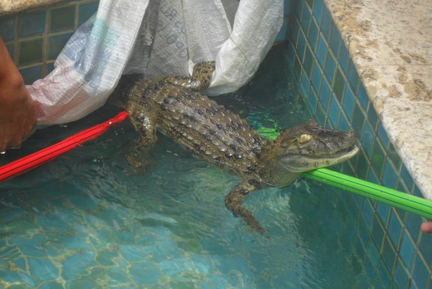 Guardas municipais do Grupamento de Defesa Ambiental resgataram um filhote de jacaré de papo-amarelo, na manhã de segunda-feira, em um condomínio localizado na rua Projetada Treze, no Recreio dos Bandeirantes, Zona Oeste do Rio. Os agentes receberam a solicitação por meio da Central 1746, da Prefeitura do Rio.