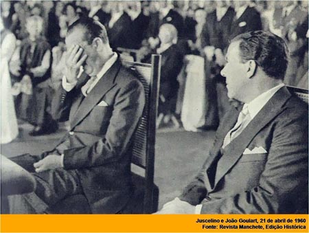 21 de abril de 1960 – A primeira sessão do Congresso Nacional em Brasília é aberta às 11h30, pelo presidente do Senado Federal, então vice-presidente da República, João Goulart. Com o plenário e galerias lotados, uma comissão de parlamentares conduz o presidente JK à Mesa Diretora, onde estão Jango, o presidente da Câmara dos Deputados, Ranieri Mazzilli, o cardeal Cerejeira, de Portugal, e o presidente do STF, ministro Barros Barreto. JK ocupa seu lugar ao lado de Jango, sendo saudado de pé pela maioria dos que estão no Plenário e nas galerias. As oposições, silenciam.