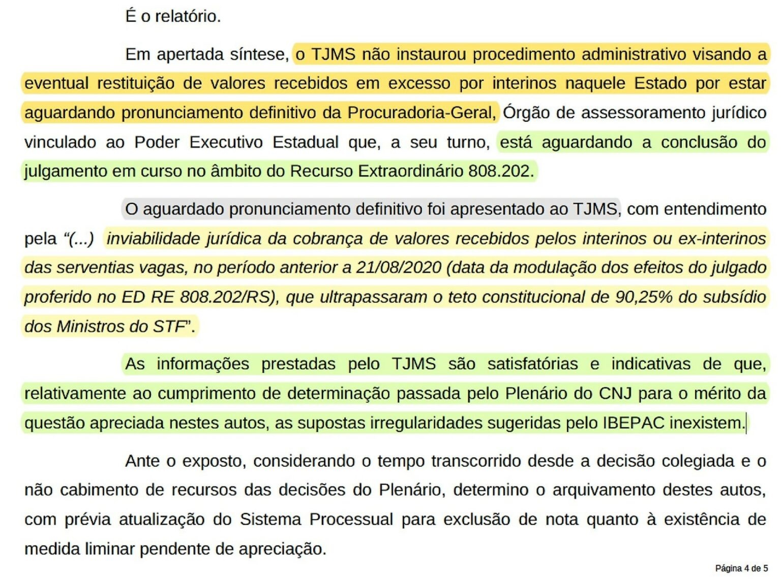 Em apertada síntese, o TJMS não instaurou procedimento administrativo visando a eventual restituição de valores recebidos em excesso por interinos naquele Estado por estar aguardando pronunciamento definitivo da Procuradoria-Geral, Órgão de assessoramento jurídico vinculado ao Poder Executivo Estadual que, a seu turno, está aguardando a conclusão do julgamento em curso no âmbito do Recurso Extraordinário 808.202. O aguardado pronunciamento definitivo foi apresentado ao TJMS, com entendimento pela “(…) inviabilidade jurídica da cobrança de valores recebidos pelos interinos ou ex-interinos das serventias vagas, no período anterior a 21/08/2020 (data da modulação dos efeitos do julgado proferido no ED RE 808.202/RS), que ultrapassaram o teto constitucional de 90,25% do subsídio dos Ministros do STF”.