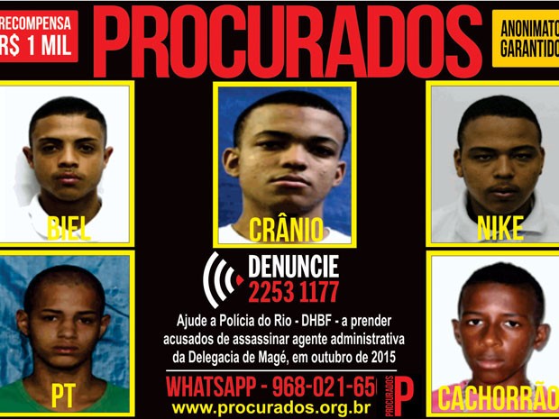 O Portal dos Procurados está oferecendo a recompensa de R$ 1 mil por informações que levem às prisões de Gabriel Almeida Pereira, o Biel ou Da Redley, de 21 anos; Marcelo Matheus Pereira Santos, o Crânio ou Toto Bola, 21; Gean Ferreira da Silva, o Nike, 19; Patrick Anderson de Moraes Botelho, o PT, 19 e Thalis Rosário Salles, o Cachorrão, 20 anos.