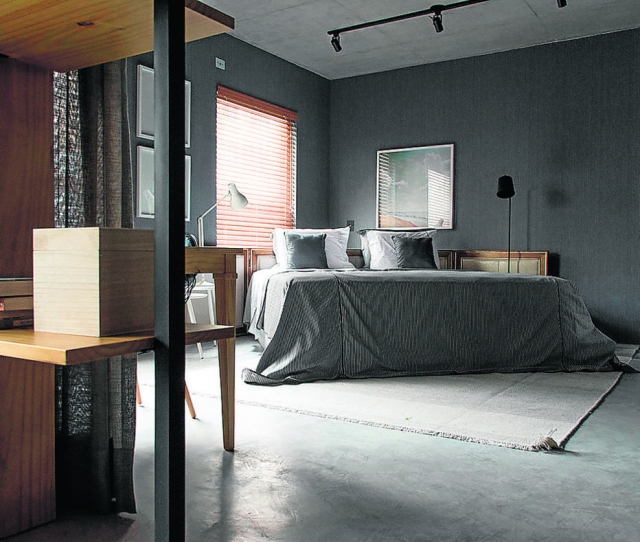 Não é apenas a cortina de pregas acentuadas que isola o dormitório nos raros momentos que a privacidade se faz necessária. Ou a iluminação pontual e dramática, realçada pelas paredes cinza chumbo. Para onde quer que se olhe, existe sempre algo de cenográfico associado à decoração deste apartamento de 75m², localizado no bairro da Bela Vista, na região do baixo Augusta, em São Paulo.