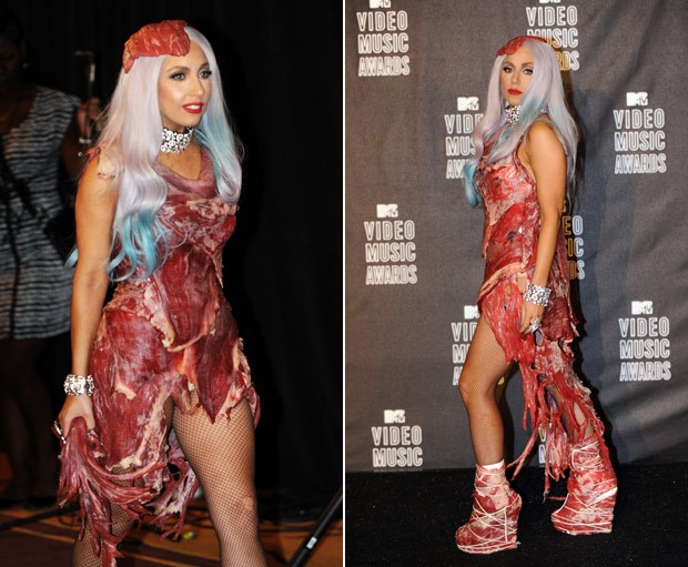 Lady Gaga usou o vestido quando recebeu o prêmio de vídeo do ano pela música “Bad Romance”. O debate então se concentrou em se a cantora pop estava fazendo com ele alguma declaração ou apenas queria chocar.
