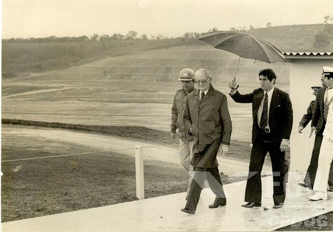 Na manhã seguinte, saímos bem cedo, depois de um café da manhã bem ralo, como os mineiros adoram. Minutos depois chegava o presidente, acompanhado dos ministros dos Transportes, que era o general Dirceu Nogueira, e de Minas e Energia, Aureliano Chaves. Além do frio, chovia muito. Geisel autorizou que eu e o Cornélio subíssemos ao palanque, para nos abrigar. Ao meu lado, o João Pinheiro, fotógrafo do presidente. Os outros jornalistas ficaram em um palanque fronteiro, coberto, mas entupido de gente.