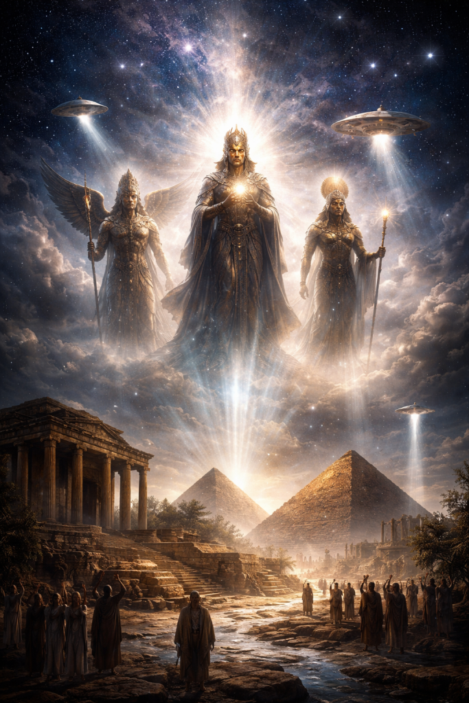 Desde que o homem ergueu os olhos para o firmamento, uma pergunta silenciosa atravessa milênios: quem eram, de fato, os deuses que desciam dos céus em carruagens de fogo, envoltos em luz, trovões e poder? Muito antes de telescópios, foguetes ou satélites, civilizações inteiras já narravam encontros com seres vindos do alto — figuras capazes de ensinar astronomia, agricultura, arquitetura e leis, como se carregassem conhecimentos muito além do tempo humano.