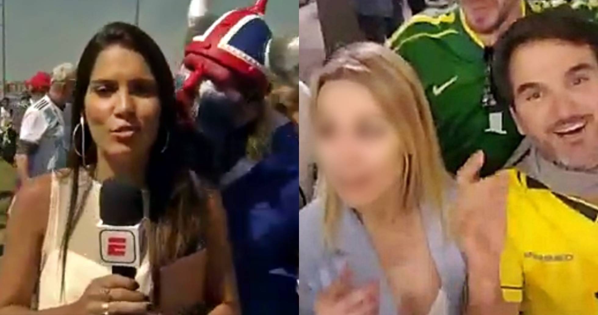 À esquerda, torcedor islandês constrange repórter. Ao lado, brasileiros ridicularizam mulher na Rússia. Foto: Reprodução