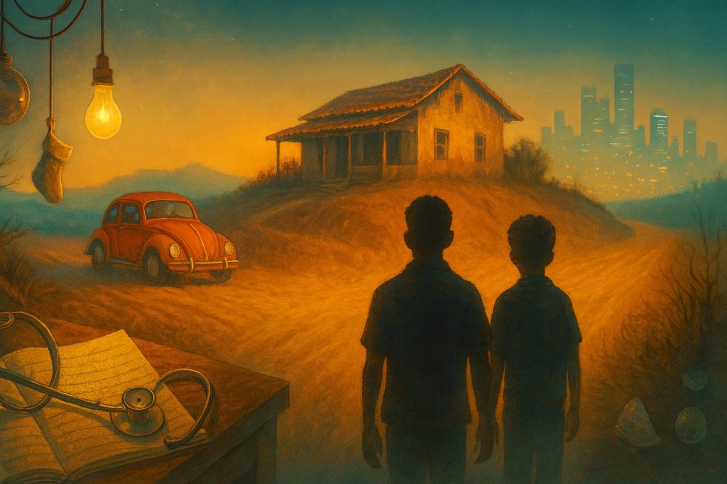Foi justinho naquele dia, quando a gente estava no segundo andar, olhei para uma janela do lado e vi, lá embaixo, um movimento estranho. Chegava um carro novinho, azul claro, seguido de um jipe cheio de capanga. Não entendi até hoje se foi coincidência, se eles estavam esperando, ou se chamaram eles. Chamar não, não ia dar tempo. Eles deviam era estar esperando mesmo, avisados, de atalaia, deviam estar em algum lugar ali perto. Mas eu fiquei pensando, porque, justo naquele dia, em que o Tino resolveu ir mais cedo, eles apareceram do nada. Só sei que quase mijei nas calças quando vi os carros indo em direção à subida do morro. Soltei um grito e meu irmão veio ver o que tinha acontecido. Comecei a desesperar. E ele falou “não liga, deixa que eu resolvo, só abre essas janelas aqui do lado e fica aqui em cima, desce quando eu te chamar”. Não entendi nada. A gente tinha era que correr, sair dali o mais rápido possível, voltar pra nossa casa na avenida. Mas não daria tempo. O único caminho de volta era a estradinha que levava ao morro, o capim estava seco naquela época, ia ser difícil eles não verem a gente. A parte dos fundos não ia dar pra descer. Esconder ali, pior, acabavam nos achando e íamos pra cadeia, ou pro cemitério. Eu apavorei, agarrei a tremer, desandei a chorar, pensei o que seria de mim, ou do Tino. Pois meu irmão, em vez de medrar, ficou na frente da casa, esperando que nem dono, com um pedaço de pau na mão. E, não demorou muito, os homens chegaram. Do carro azul claro saiu o Doutor Abílio e o Márcio. Do outro, só capanga muito mal-encarado. Como os donos da fazenda estavam mudados! Fazia um tempo que não os via. O doutor, certamente, estava doente. Mas com aquela feição dura de sempre. O Márcio foi que falou “o que é que você está fazendo aqui?”. E eu, de onde estava, ouvia tudo. Meu irmão respondeu “se eu chegasse antes, acho que ainda pegava eles pro senhor”. E eu não entendia. Pegava quem? A artimanha dele… Fez os homens acreditarem que, pouco antes, víramos vir alguém das bandas da casa grande, e que subimos o morrinho pra ver o que se passava. Chegamos lá, topamos com a casa arrombada e as janelas do lado abertas. E ele pegou um pedaço de pau e entrou na casa, com medo do que ia encontrar lá, de ter gente estranha, e demos busca em tudo que foi canto, e não encontramos ninguém. Que ia me chamar, pois, ainda assim, estava com medo de eu ficar sozinho lá dentro e sofrer alguma maldade. Ele me gritou e eu desci. E ele ainda teve a presença de espírito de dizer “olha, o mano ficou tão assustado que até se treme”. A cara deles era desconfiança, ou só dúvida mesmo. Certeza eu posso garantir que eles não tiveram de nada. Temi que iam matar a gente ali mesmo, não conhecia aqueles capangas. Só sei que o Doutor Abílio mandou a gente ficar calmo, que estava tudo bem, agradecia muito o empenho, estava entendendo tudo. Mas achava que, para nossa própria segurança, não era bom mais que ficássemos morando ali. Que nos daria um prazo de três dias para sairmos. Não, a mãe e os outros irmãos não precisavam ir. Até porque, a mãe tinha dívida com ele. Nós dois devíamos ir embora. Três dias. E foi outra gritaria lá em casa. “Que velho odiento”, disse a mãe, chorando. A vó, nesse tempo, já andava meio alheia, fraca das ideias. Não dava mais opinião. Eu pensei o que seria de mim, de nós, da mãe e da vó que ficariam sozinhas com os irmãozinhos e a filha da Lalinha, que nesta época já era uma garotinha brilhante, cheia de gênio.