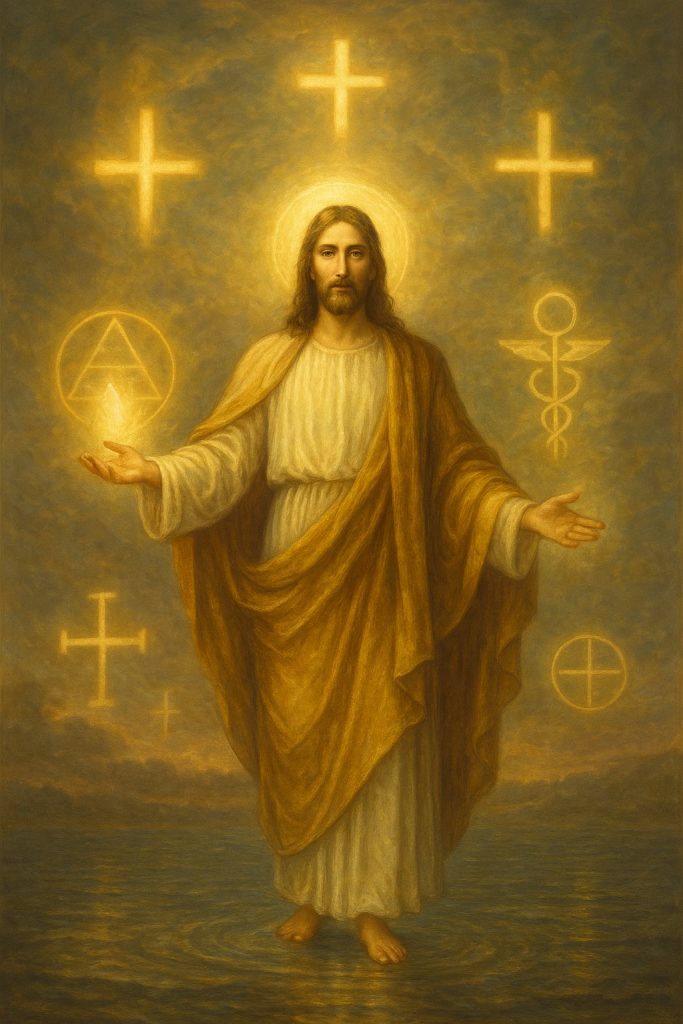 Nos Evangelhos apócrifos, como o de Tomé e o de Filipe, o Cristo é descrito como o revelador dos “mistérios do Reino”, portador de um ensinamento iniciático reservado àqueles “que têm ouvidos para ouvir”. Em perspectiva hermética, Jesus representa o Sol espiritual, o Logos que irradia luz e ordem ao cosmos. A Cruz, em sua dimensão esotérica, é o símbolo da união dos quatro elementos — fogo, água, ar e terra — e da ascensão da alma pela vertical da luz.