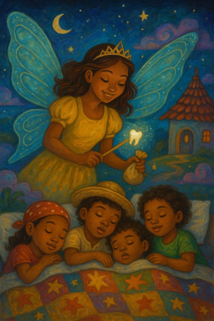 No silêncio da noite quente, entre os grilos e o cheiro de terra molhada da chuva que passou, lá vem ela: a Fada dos Dentes nordestina. Ela não deixa moeda, porque sabe que por ali moeda compra pouco. Em vez disso, deixa um bilhetinho com cheiro de alfazema, desejando coragem, saúde e um sonho bonito, desses de voar em jumento alado ou brincar com lampiões de vaga-lume.