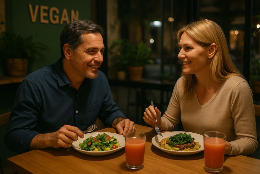 À noite, o futuro casal Maranata foi comemorar com um jantar vegano regado a suco de goiaba.