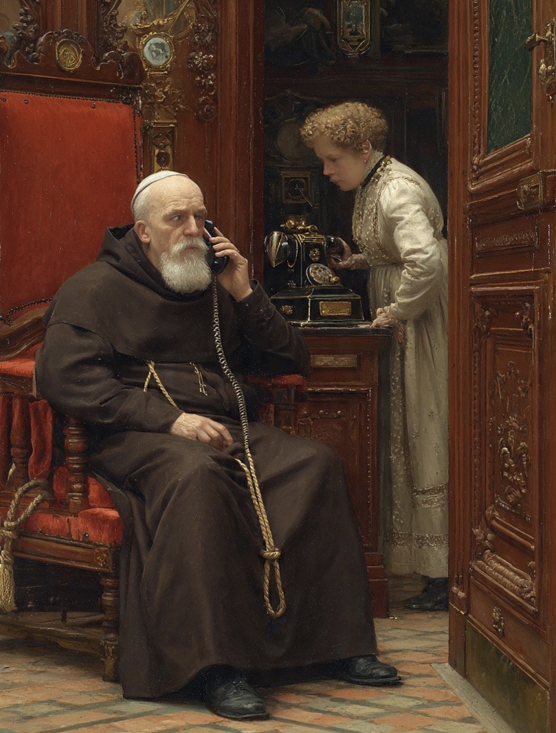 De súbito, um homem alto, de hábito castanho e com uma corda amarrada à cintura aparece na sala de telemóvel na mão.