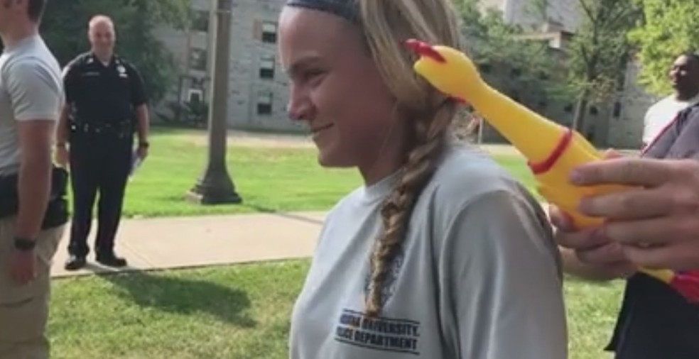 Uma academia de polícia do estado americano de Indiana está usando o “teste da galinha” para testar o foco dos recrutas. O teste consiste em um superior, de surpresa, apertar uma galinha de borracha próximo ao rosto dos recrutas para ver se eles mantêm a concentração.