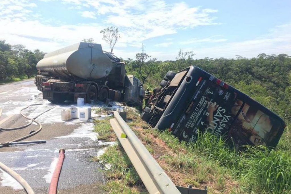 Um acidente envolvendo um caminhão tanque, carregado com óleo diesel, e o ônibus da cantora sertaneja Iasmin Santos, na Rodovia 040, entre Cristalina e Luziânia, neste sábado (22), deixou uma pessoa morta e cinco feridas.