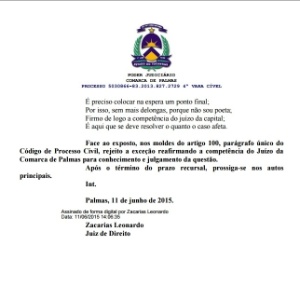 Em decisão proferida no dia 6 de julho, o juiz da 4ª Vara Cível de Palmas Zacarias Leonardo, entrou no clima literário e respondeu com um texto em prosa e poesia. A primeira parte, em verso, dizia: “É preciso colocar na espera um ponto final;/ Por isso, sem mais delongas, porque não sou poeta;/ Firmo de logo a competência do juízo da capital;/ É aqui que se deve resolver o quanto o caso afeta”.
