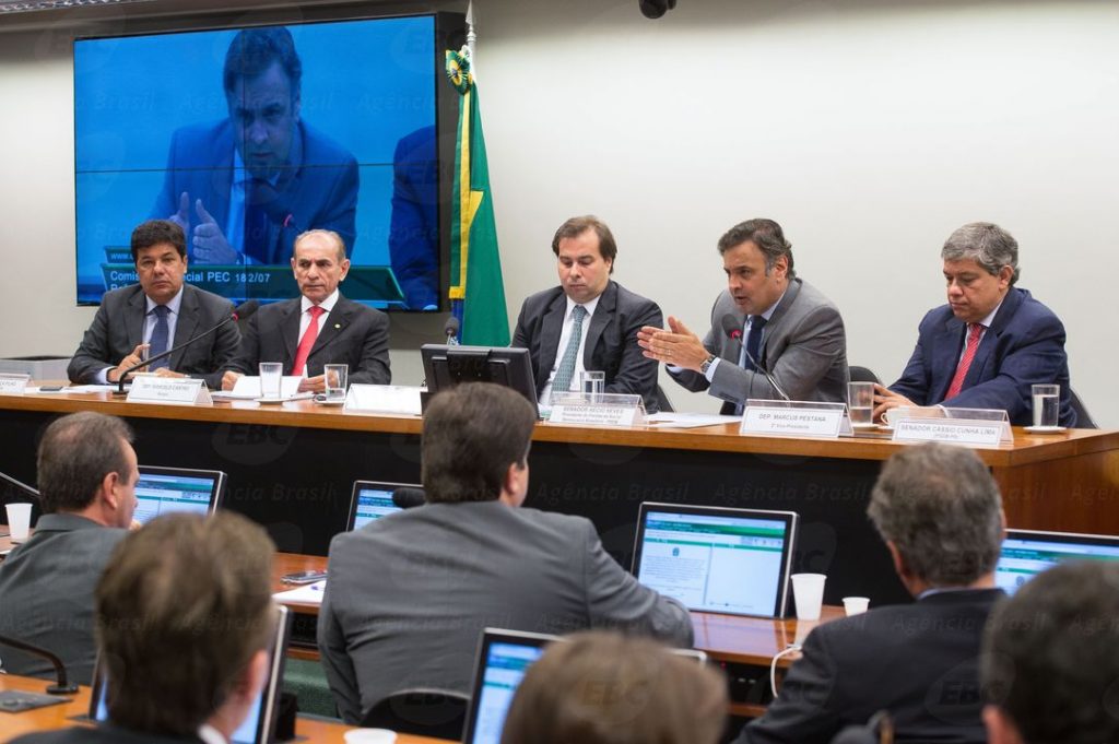 Para o senador, o fim das coligações proporcionais representaria o aprimoramento do sistema e funcionaria como uma cláusula de barreira indireta. Segundo ele, o partido defende o voto distrital misto, no qual parte das cadeiras do Legislativo seria ocupada pelo sistema distrital (majoritário) e parte pelo sistema proporcional de lista fechada. “[Este] me parece o sistema mais adequado para manter uma conexão maior dos representados com seus representantes.” Aécio destacou que a divisão não precisa ser meio a meio. “Pode ser 30% a 40% pela lista e 70% a 60% pelos distritos.”