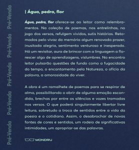 A obra traz linda coleção de poemas que exploram uma gama de sentimentos e reflexões sobre a existência, utilizando a natureza – com destaque para a água, a pedra e a flor – como metáforas centrais da experiência humana.