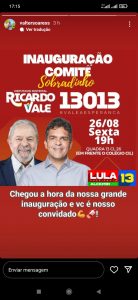 Ricardo Vale vai disputar uma cadeira na Câmara Legislativa pela Federação PT-PV-PCdoB. Ele vai inaugurar seu comitê na sexta, 26. A Federação tem como candidato ao Palácio do Buriti, com o aval de Lula, o deputado distrital Leandro Grass (PV), que é ignorado por Ricardo.