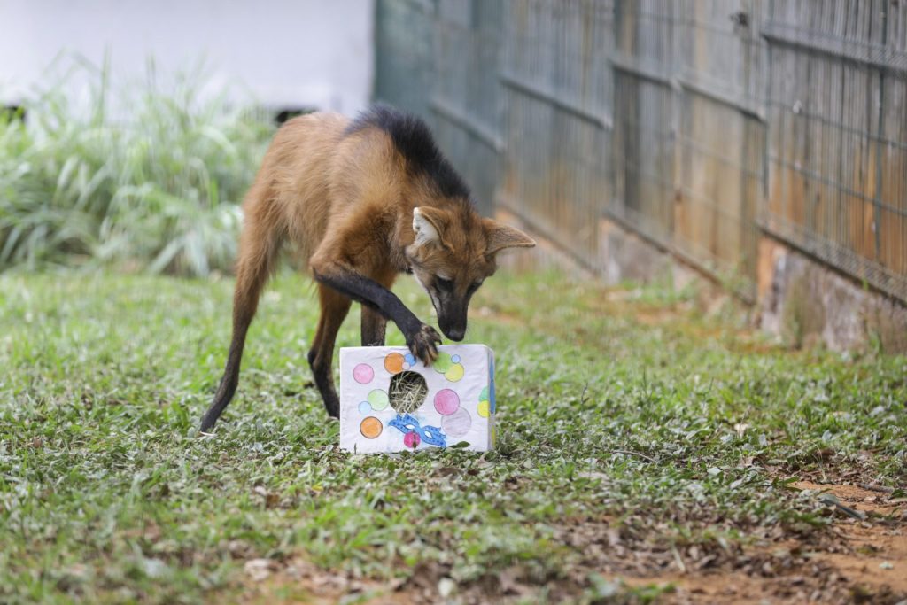 A prática, conhecida como enriquecimento alimentar, faz parte da rotina do zoo e envolve diversos animais que habitam o espaço. Essas técnicas são fundamentais para estimular os instintos naturais dos bichos. Além da lobo-guará Atena, jabutis e um tamanduá-bandeira também participaram da folia com as comidas surpresa. Aberta para visualização do público, a atividade utiliza recipientes recheados de aromas e surpresas, estimulando o faro e as habilidades motoras dos animais.
