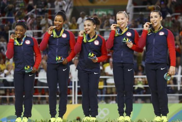 Confirmando o favoritismo, a seleção norte-americana levou a medalha de ouro na ginástica feminina por equipes, com 184.897. Com 176.688, as russas ficaram com a medalha de prata e as chinesas (176.003) com a de bronze. As meninas da seleção do Brasil ficaram na oitava colocação, com 172.087 pontos.