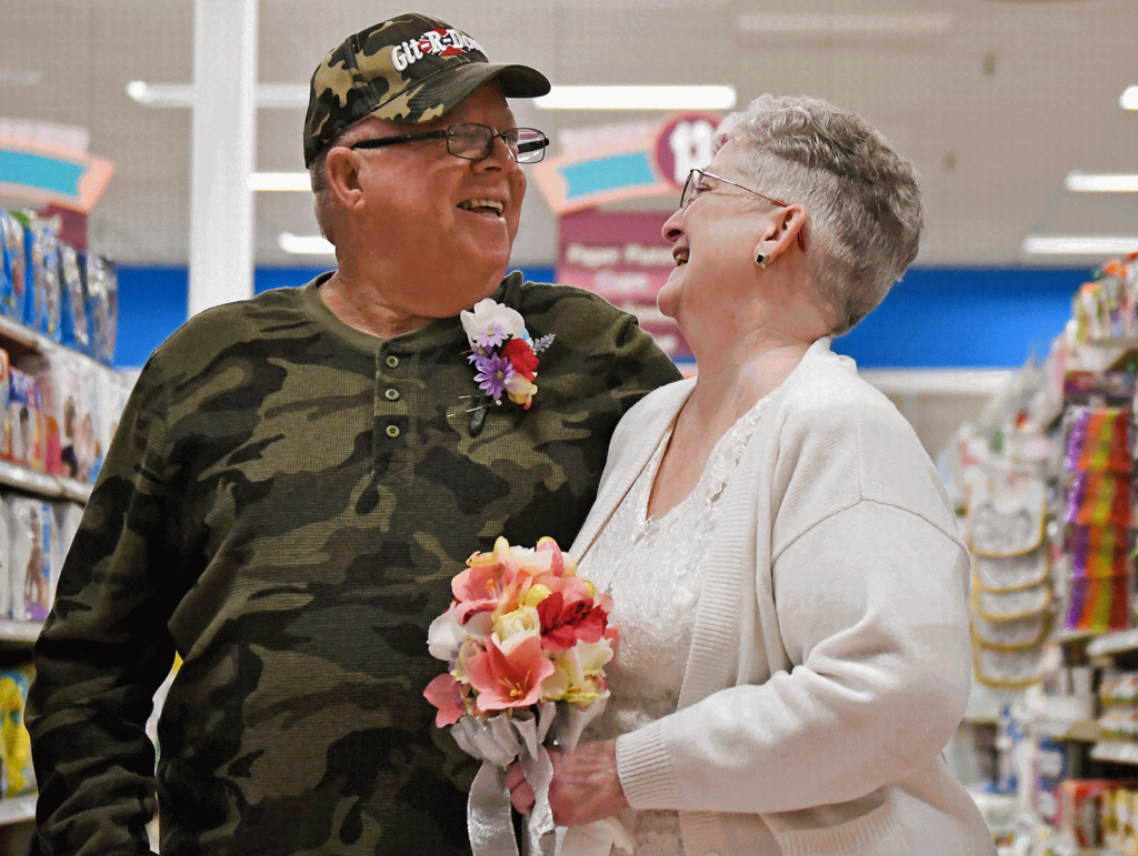 O caso ocorreu na cidade de Lower Burrell. Larry Spiering, de 69 anos, e Becky Smith, de 61, casaram-se no último domingo (1) no Community Supermarket, onde eles se conheceram há 10 anos.