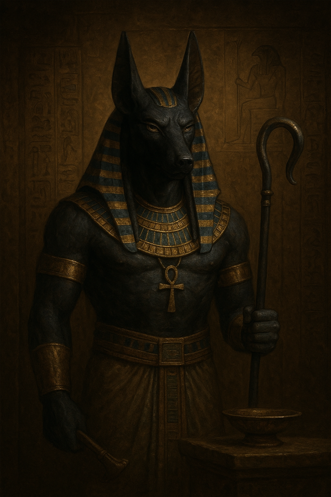 Filho de Osíris, o deus da ressurreição, e de Néftis, deusa da noite e das fronteiras, Anúbis simbolizava a ponte entre dois mundos. Sua figura, metade homem, metade animal, encarnava a vigilância eterna diante da morte — o chacal, caçador noturno das necrópoles, tornou-se o protetor das tumbas e o guia das almas.