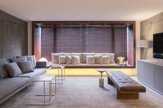 Com uma iluminação natural privilegiada, Kleber levou a proposta minimalista até mesmo aos pontos de luz espalhados pela casa. Com o pé-direito baixo, poucas lâmpadas foram acopladas ao teto, e a opção foi por usar luminárias de chão, como na sala de estar, e apenas um trilho luminoso paira sobre a mesa de jantar. “A iluminação foi toda trabalhada de forma difusa ou indireta para manter uma estética limpa”, diz Arigucci, que instalou um enorme banco de madeira com persiana no vão de uma das aberturas da área social, para controlar a luz natural que invade o ambiente.