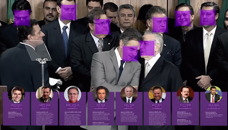 Na versão aplicativo, totalmente gratuita, o Detector de Corrupção utiliza um sistema de reconhecimento facial que pinta de roxo o rosto de políticos envolvidos em denúncias de corrupção.