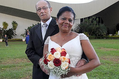 Aquele dito popular de que o amor não tem idade combina muito bem com a história da dona de casa Rosilda Pereira Cerqueira, de 54 anos, e do aposentado Vilmo de Freitas Nunes, de 61. Depois de 34 anos juntos e duas filhas, eles resolveram assinar a papelada matrimonial na tarde deste sábado (30). A cerimônia teve como testemunha outros 51 casais, que também oficializaram a união durante o casamento comunitário no Teatro Pedro Calmon, no Setor Militar Urbano, em uma ação promovida pela Secretaria de Justiça e Cidadania.