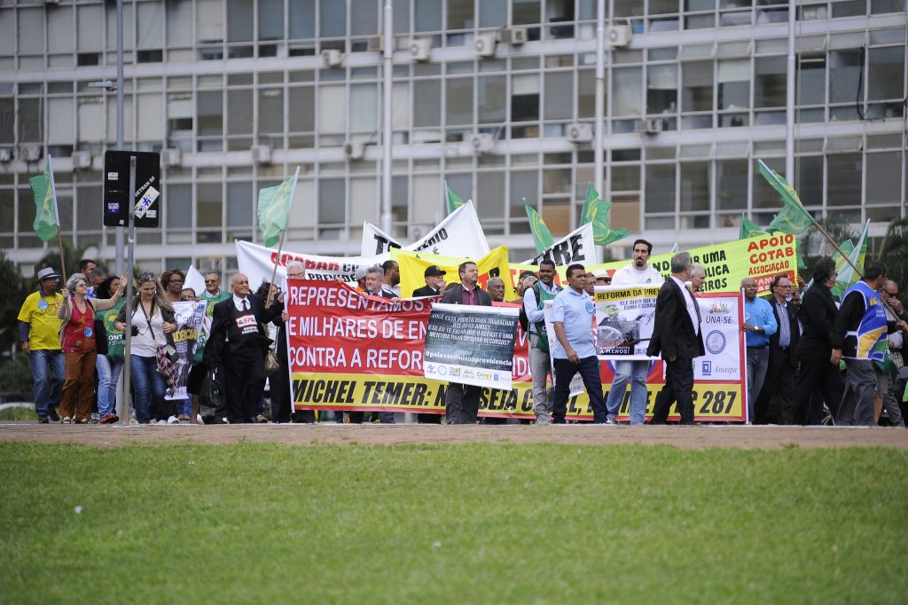Cerca de 300 de aposentados e pensionistas protestaram nesta segunda (15) no Senado contra a Proposta de Emenda Constitucional 287/2016, que trata da reforma da Previdência. A proposta está em tramitação na Câmara dos Deputados e pode ser votada ainda no primeiro semestre pelos deputados e senadores.