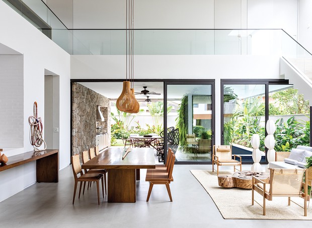 Como a casa é usada para o lazer, o casal com três filhos adultos pediu soluções práticas, para facilitar a manutenção, e sustentáveis, que geram economia de água e energia elétrica. Além dos painéis de vidro, que fecham a área social sem bloquear os raios solares, o projeto inclui claraboias, uma na largura da escada no living e outras nos banheiros, para a iluminação zenital.