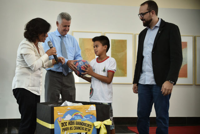Durante o evento, o governador, Márcia Rollemberg e o secretário de Políticas para Crianças, Adolescentes e Juventude, Aurélio de Paula Guedes Araújo, fizeram a entrega simbólica de brinquedo ao estudante Rafael Alexandre dos Reis, do Centro de Atenção Integral à Criança (Caic) Juscelino Kubitschek, do Núcleo Bandeirante.