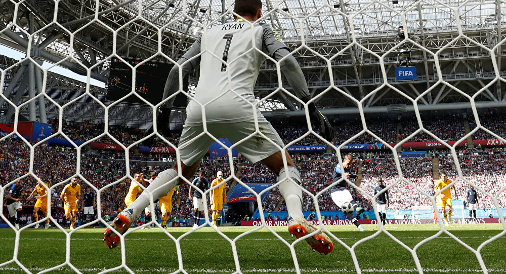 O próprio Griezmann converteu a cobrança com um forte chute no canto esquerdo do goleiro Ryan, aos 12 minutos. Mas o alívio dos favoritos durou apenas três minutos. Aos 15, o zagueiro Umtiti cometeu erro infantil ao levantar o braço e desviar a bola com a mão dentro da área, num pênalti flagrante. Na cobrança, Jedinak bateu quase no centro e empatou com tranquilidade.