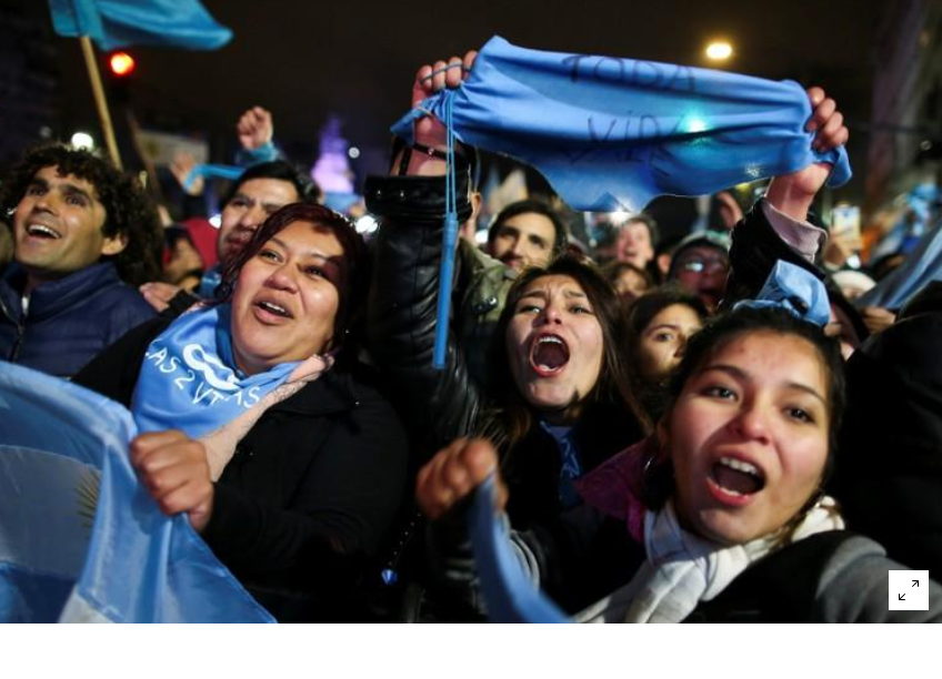 Famílias e clérigos usando bandanas azuis festejaram do lado de fora do Congresso quando o resultado foi anunciado pouco antes das 3h da manhã, balançando bandeiras da Argentina em apoio ao posicionamento da Igreja Católica contra o aborto no país natal do papa Francisco.
