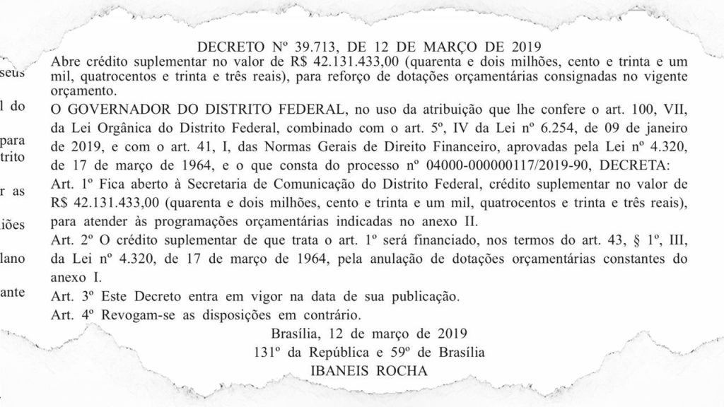 Convencido por Arruda, o governador Ibaneis Rocha mandou abrir um crédito suplementar de exatos quarenta e dois milhões, cento e trinta e um mil, quatrocentos e trinta e três reais na rubrica de publicidade. E olha que o governo está apenas começando.