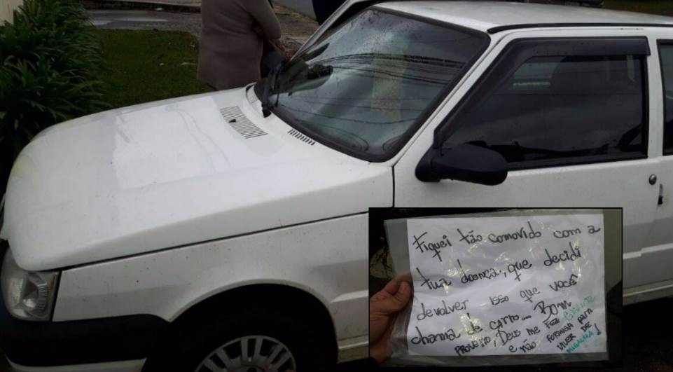 “Fiquei tão comovido com a tua doença, que decidi devolver isso que você chama de carro. Bom proveito, Deus me fez gigante e não formiga para viver de migalhas”, dizia no papel encontrado dentro de um Uno Mille branco.