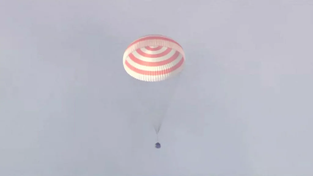 “A tripulação está bem”, disse o controle da missão em Moscou quando a cápsula caiu de paraquedas e aterrissou em uma nuvem de poeira. “A aterrissagem foi realizada com perfeição”, disse a Roscosmos, agência espacial russa.