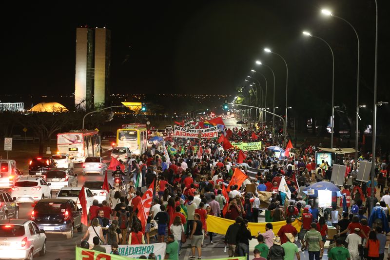 Com bandeiras do PT, da Central Única dos Trabalhadores (CUT), do Movimento dos Trabalhadores Rurais Sem-Terra (MST) e cartazes “contra o golpe”, os manifestantes marcharam do Museu da República até o gramado em frente ao Congresso Nacional.