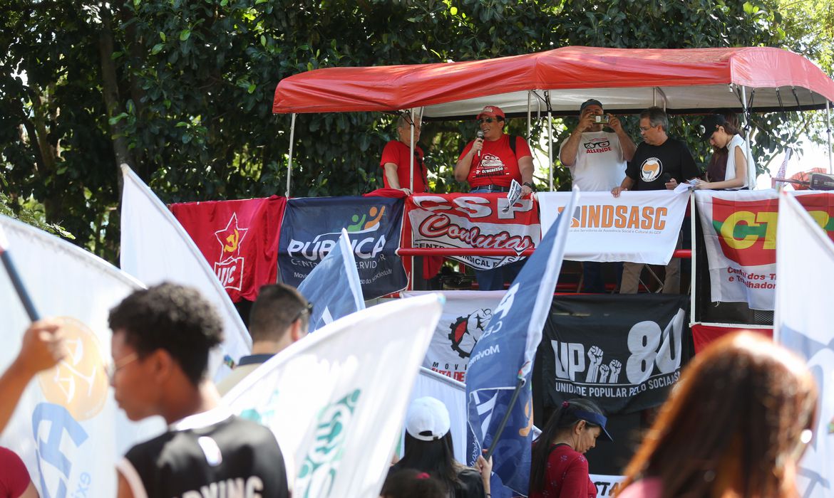 Os manifestantes de diferentes idades empunharam bandeiras e vestiram camisetas de movimentos sociais, partidos políticos e em defesa da democracia brasileira. Já os líderes sindicais se revezaram nos microfones para dialogar com os trabalhadores e protestar, durante a manhã, nos intervalos das apresentações artísticas de forró e de rap.
