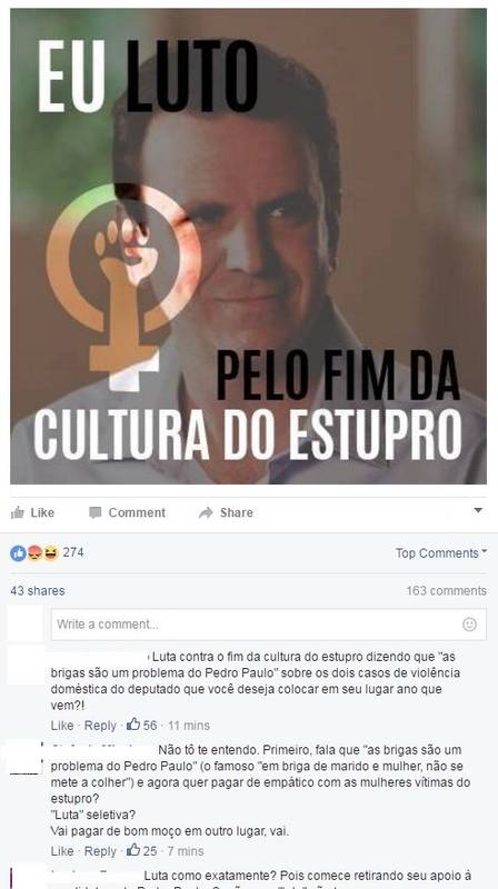 O prefeito do Rio, Eduardo Paes, aderiu à campanha “Eu luto pelo fim da cultura do estupro” e adicionou o selo à sua foto de perfil no Facebook, mas acabou sendo alvo de uma enxurrada de críticas devido a seu apoio a Pedro Paulo (PMDB) como futuro candidato à Prefeitura. Atual secretário-executivo de Coordenação de Governo, Pedro Paulo admitiu já ter agredido a ex-mulher, Alexandra Marcondes Teixeira.