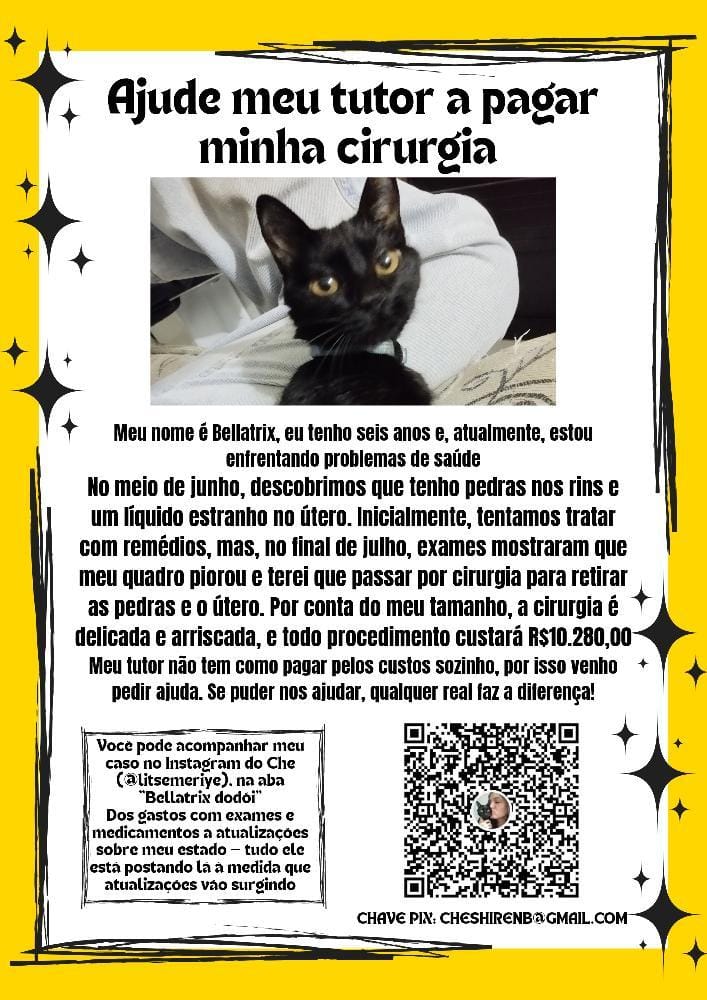 Mas agora sua constelação está em risco. O corpo frágil da felina se vê diante de duas cirurgias urgentes: a retirada do útero e a extração de cálculos renais. O valor do tratamento ultrapassa os dez mil reais — uma barreira intransponível para Tchê, seu tutor, que apesar de todo o amor, não dispõe de recursos para salvar sua companheira de jornada.