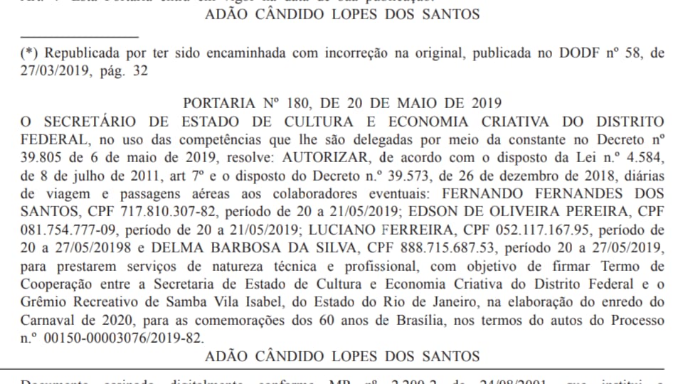 Agora, prestem a atenção, pois o enredo começa a ficar interessante. Na Portaria nº 180, de 20 de maio de 2019, o secretário de Cultura, Adão Cândido, autorizou as referidas despesas para “prestarem serviços de natureza técnica e profissional, com objetivo de firmar Termo de Cooperação entre a Secretaria de Estado de Cultura e Economia Criativa do Distrito Federal e o Grêmio Recreativo de Samba Vila Isabel, do Estado do Rio de Janeiro, na elaboração do enredo do Carnaval de 2020…” Ora! Se Delma e Luciano passaram 7 dias em Brasília, para montarem esse tal termo, o que foi que o governador assinou 7 dias antes? Até agora, o tal termo, que deveria conter as bases do acordo, não foi divulgado.