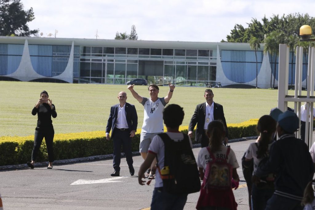 O presidente Jair Bolsonaro surpreendeu na manhã deste sábado (18), acompanhado da primeira-dama, Michele, e do general Augusto Heleno, chefe do Gabinete de Segurança Institucional, ao sair no jardim do Palácio da Alvorada e ir ao portão cumprimentar pouco mais de 100 crianças de uma escola pública de Brasília, que faziam turismo cívico pela cidade.