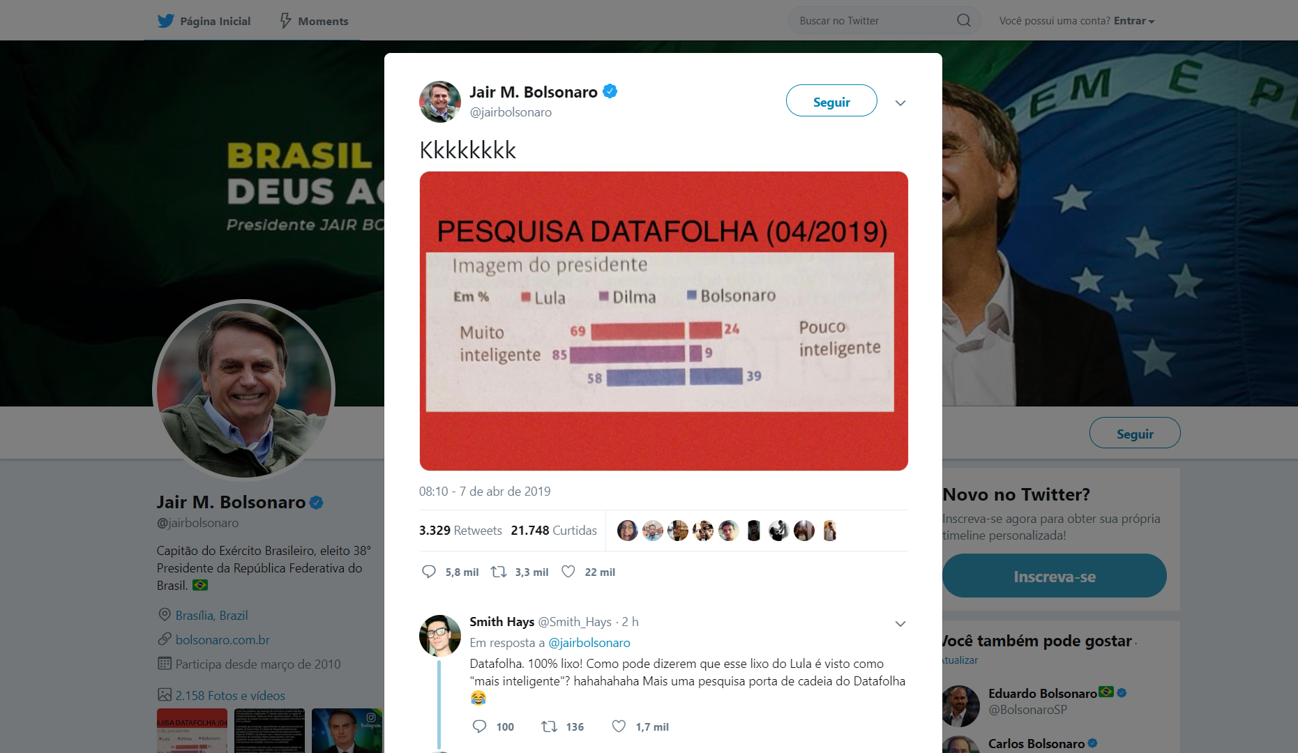 O comentário de Bolsonaro, seguido de uma gargalhada, foi o de que não ‘perderia tempo’ com o que diz o Datafolha. Na mesma pesquisa é dito que Bolsonaro é menos inteligente do que Lula e Dilma.