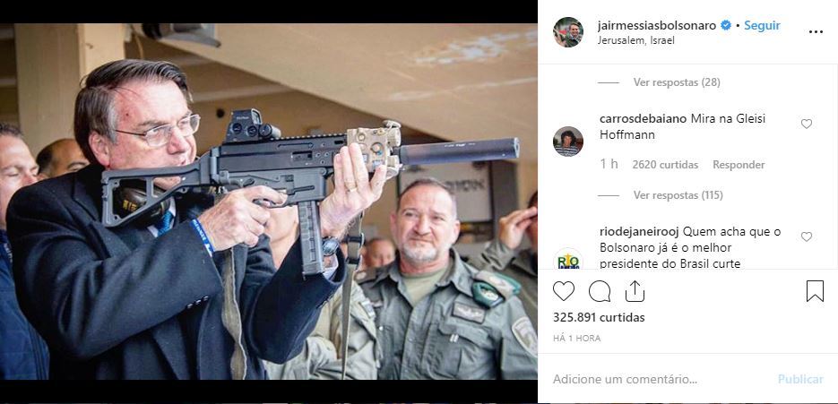 O presidente Jair Bolsonaro testou em Israel, nesta segunda feira, 1, uma submetralhadora produzida pela indústria bélica do Estado judeu. Depois publicou a imagem no Instagram. Bolsonaro escreveu na legenda da foto texto favorável ao decreto assinado em janeiro que flexibiliza o posse de armas de fogo no Brasil.