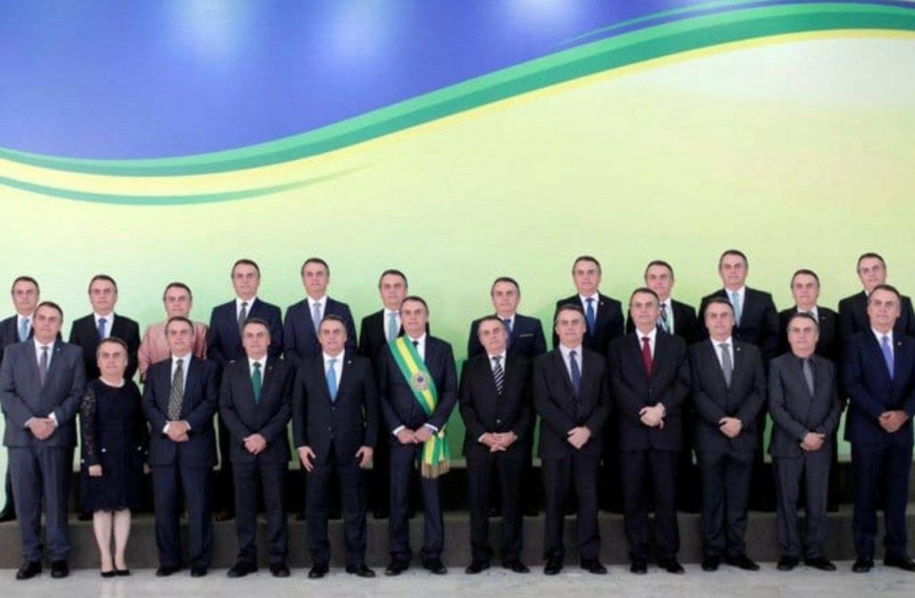 Como o governo Bolsonaro parece uma anedota, já tem uma nova piada circulando nas redes sociais. Trata-se de montagem de foto oficial da posse da equipe ministerial. Os rostos, porém, são todos de Bolsonaro. A legenda anuncia que agora ninguém mais cai. Logo após a circulação da peça, a Senhora Moro foi ao Instagram. Ironizou o presidente com um infinito EU, EU, EU…!