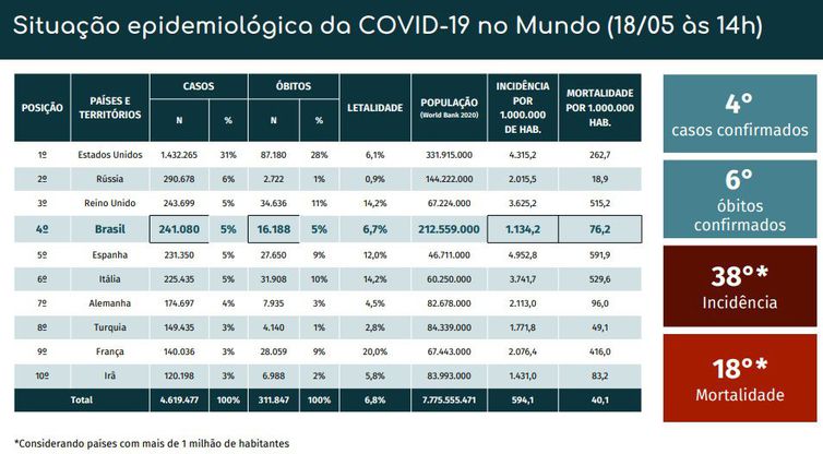 “O Brasil está em quarto em número de casos confirmados e sexto em mortes confirmadas. Quando observamos taxa de mortalidade, fica em 18º. E na incidência, em 38º considerando só países com mais de 1 milhão de habitantes”, disse.